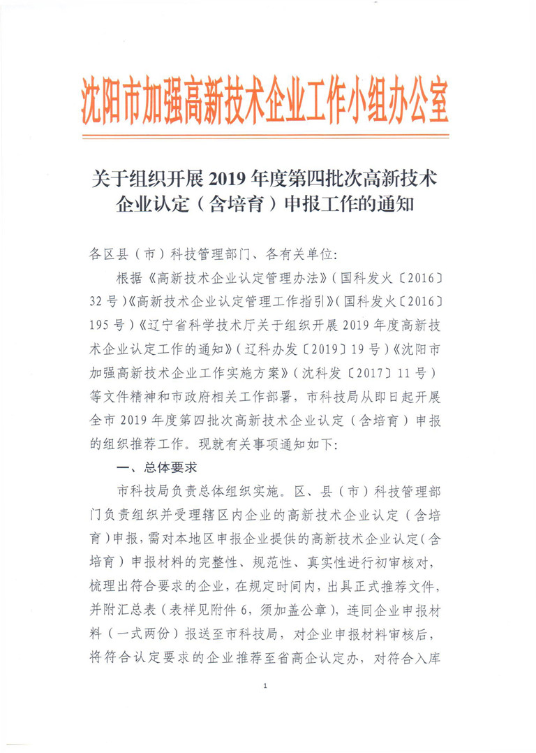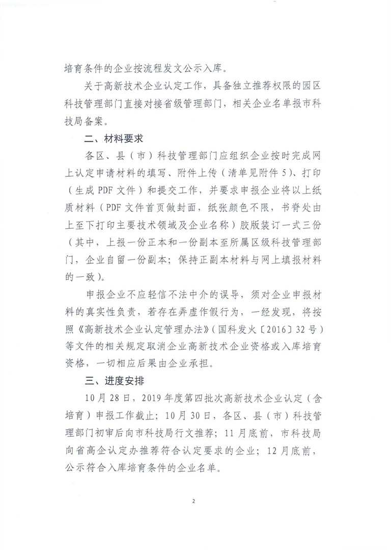 关于组织开展2019年度第四批次高新技术企业认定(含培育)申报工作的通知