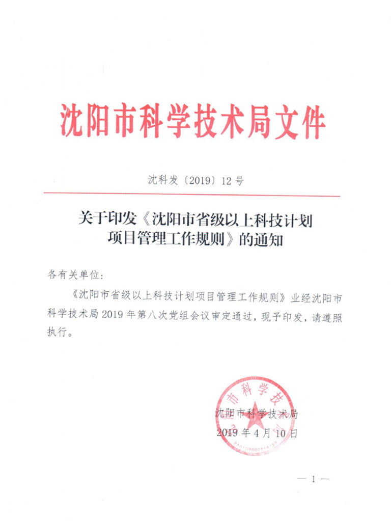 关于印发《沈阳市省级以上科技计划项目管理工作规则》的通知
