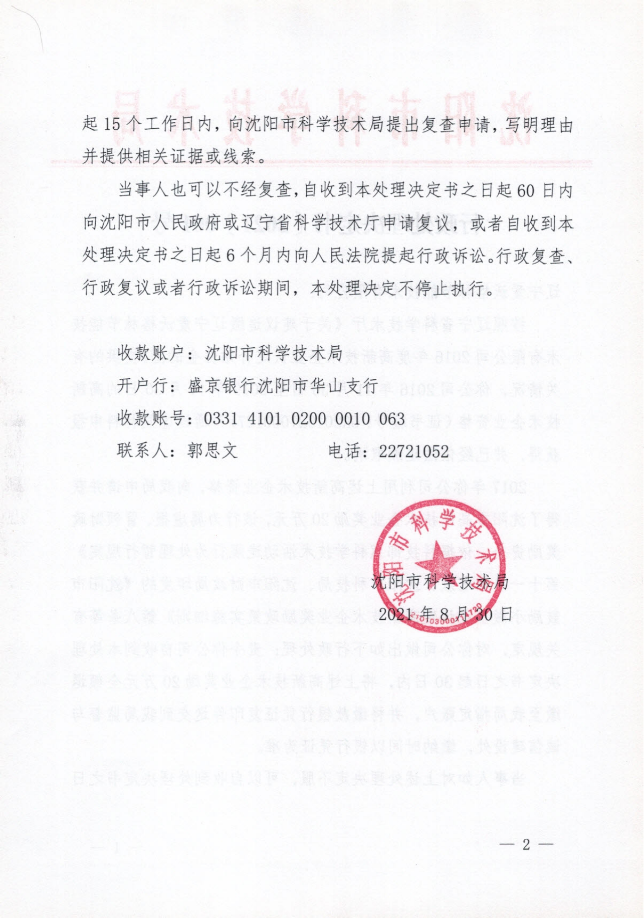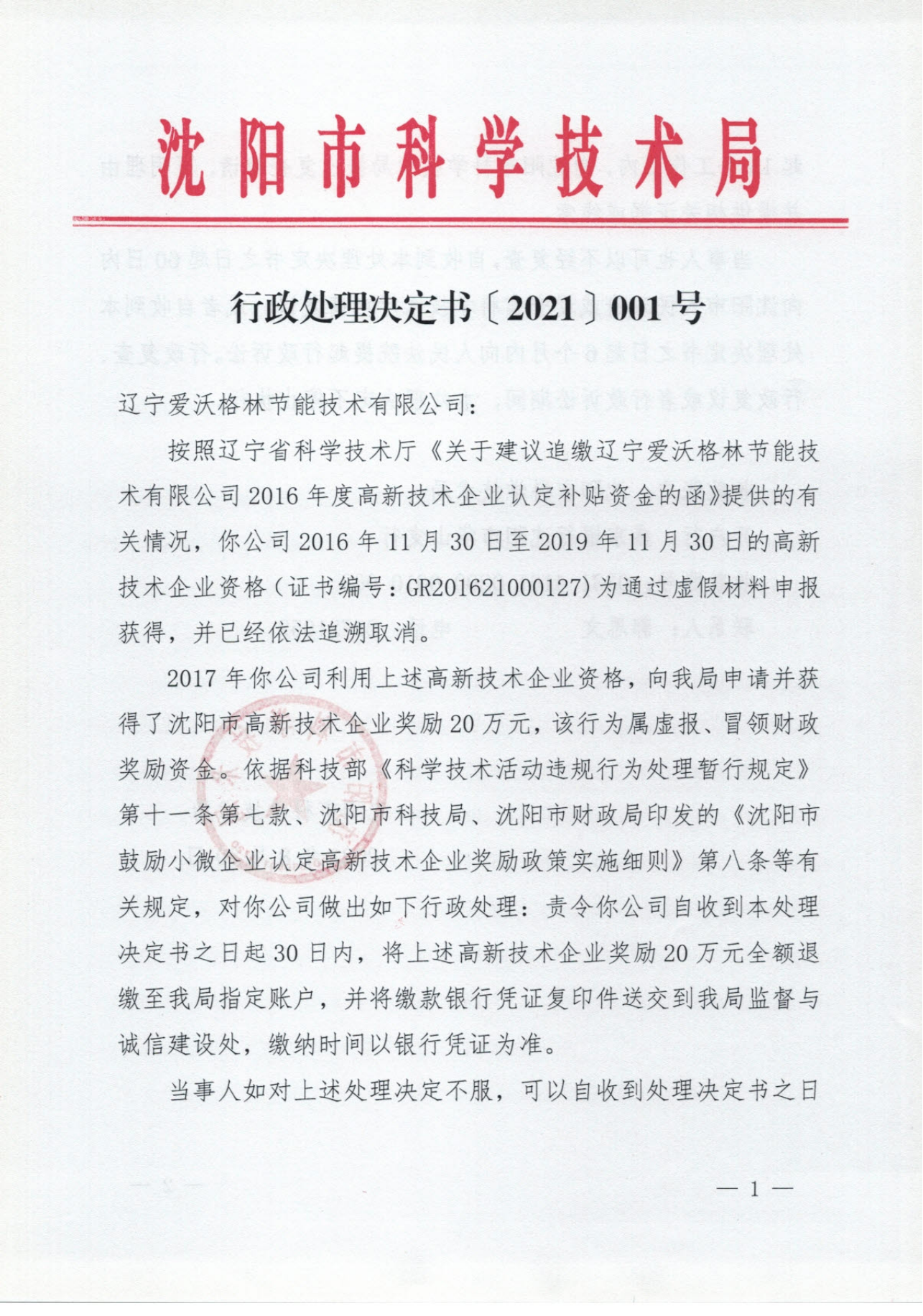 市科技局关于追回辽宁爱沃格林节能技术有限公司高企奖励资金的行政处理决定书