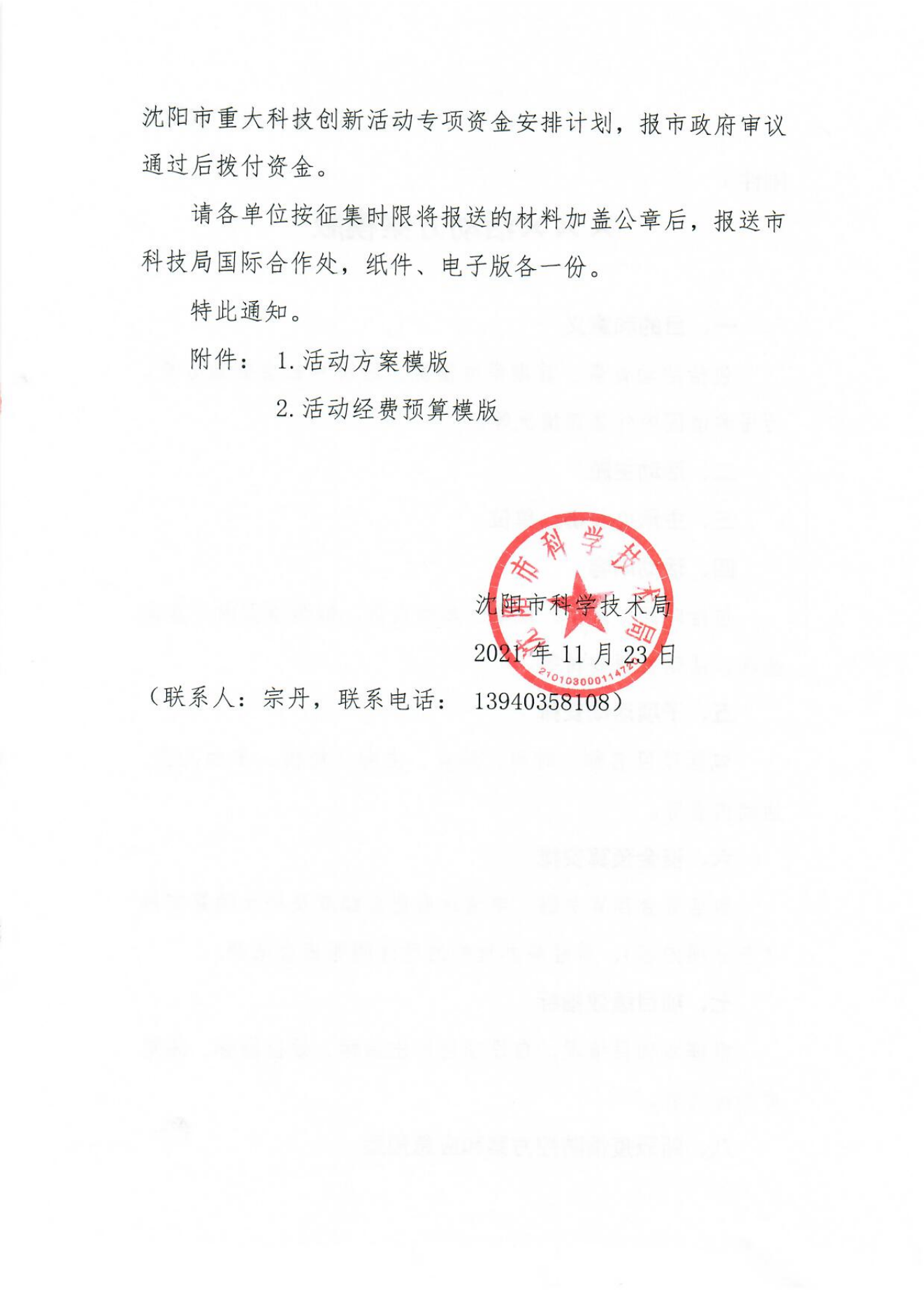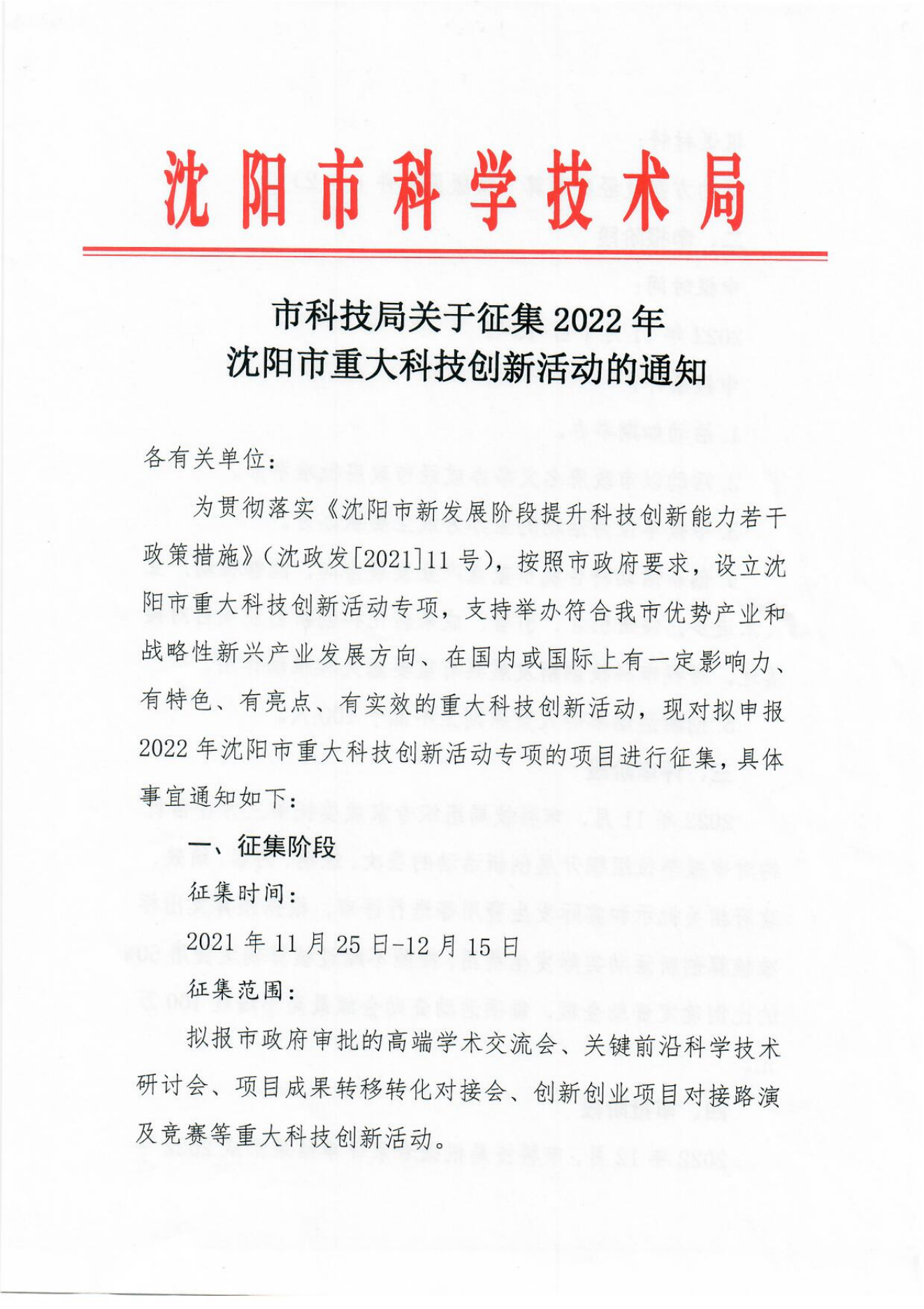 市科技局关于征集2022年沈阳市重大科技创新活动的通知