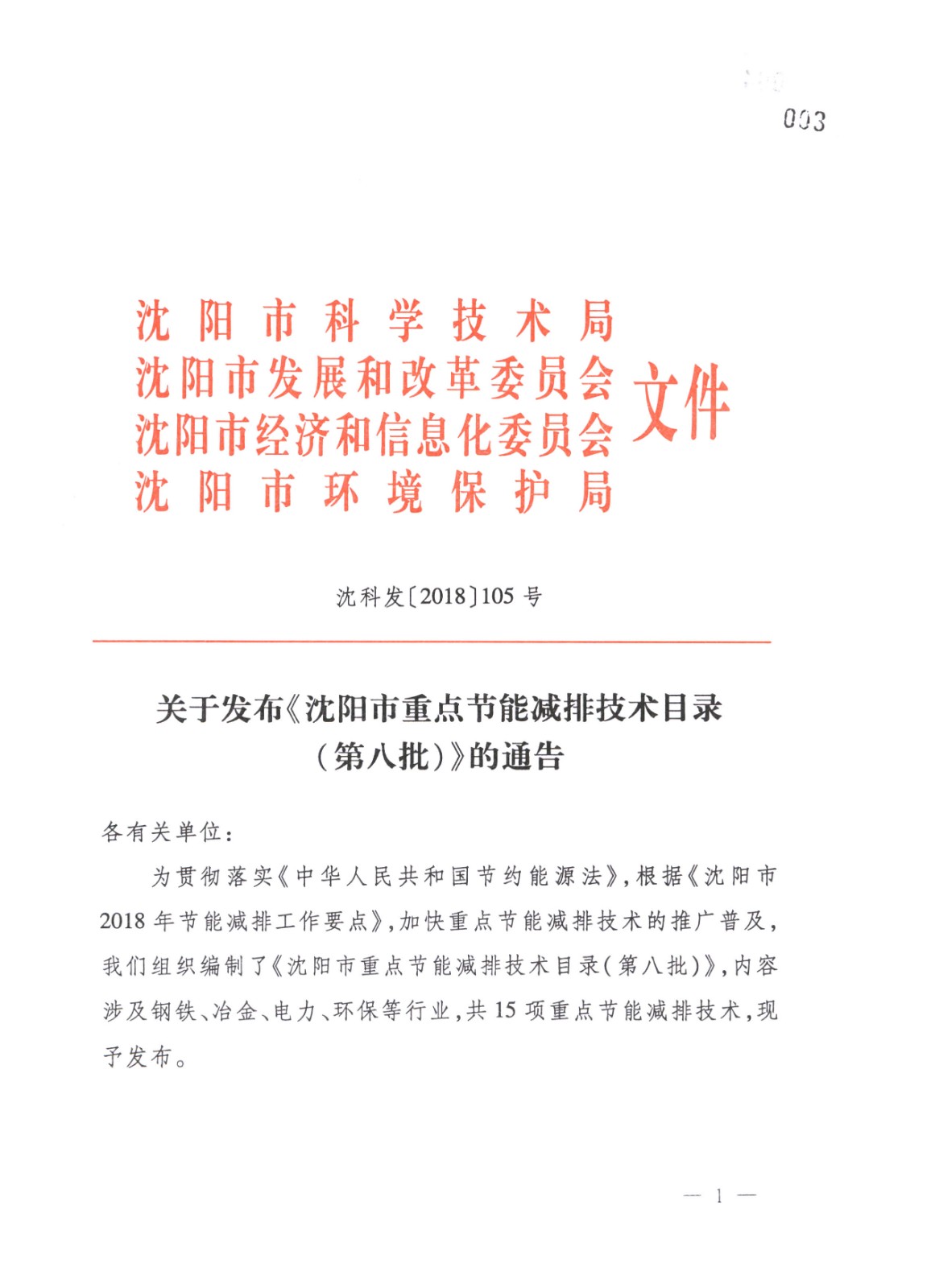 关于发布《沈阳市重点节能减排技术目录(第八批)》的通告