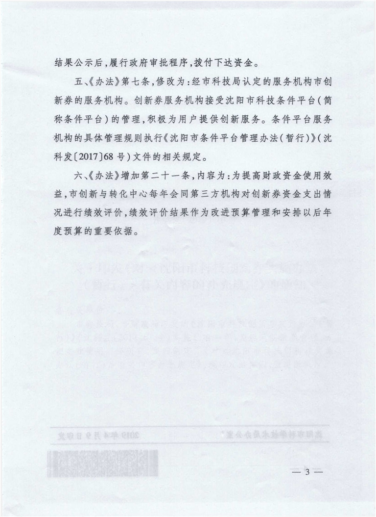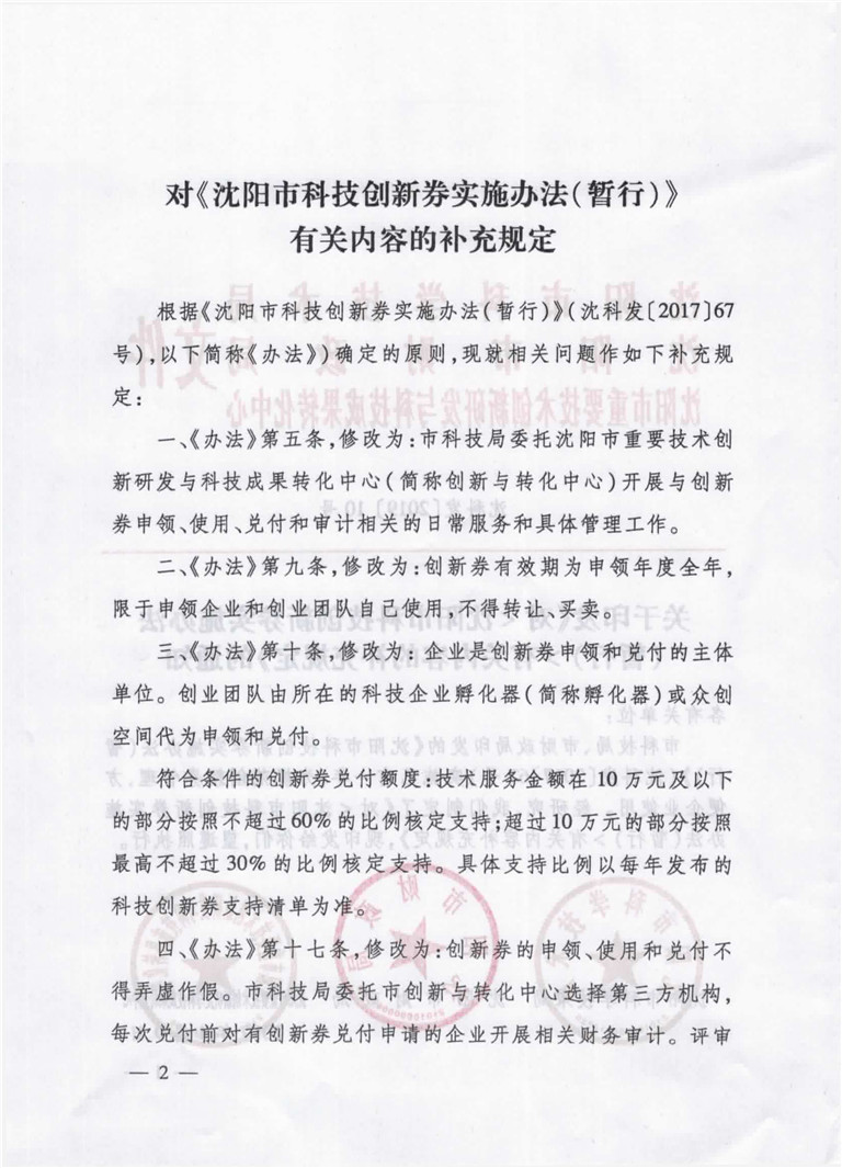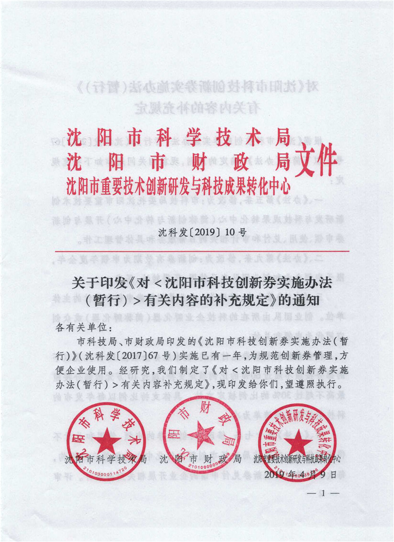 关于印发《对<沈阳市科技创新券实施办法(暂行)>有关内容的补充规定》的通知