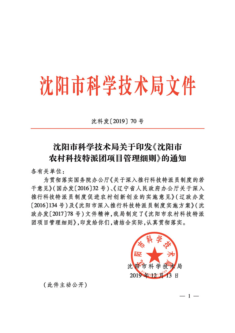 沈阳市科学技术局关于印发《沈阳市农村科技特派团项目管理细则》的通知