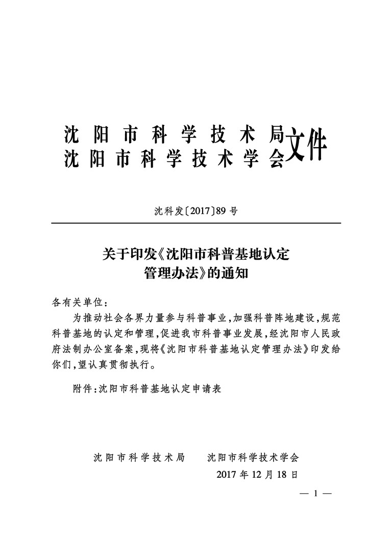 关于印发《沈阳市科普基地认定管理办法》的通知