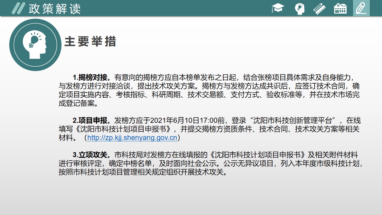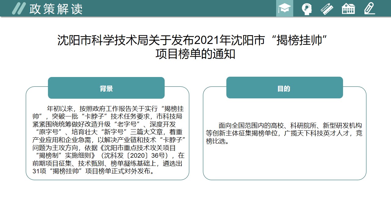 图解:《沈阳市科学技术局关于发布2021年沈阳市 “揭榜挂帅”项目榜单的通知》政策解读